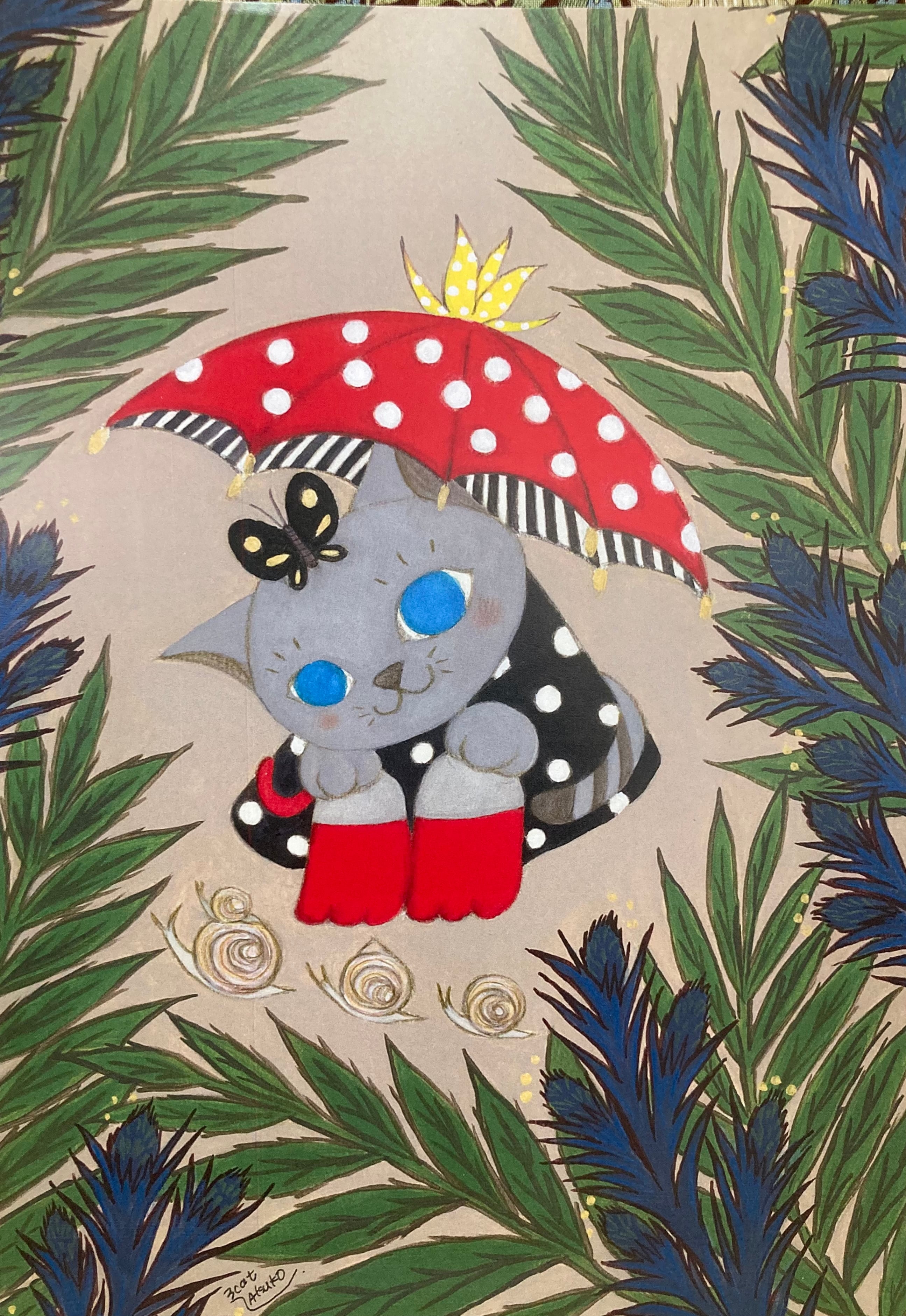 赤い水玉の傘をさして、 ねここちゃんは森の中で雨や音を感じています。 葉っぱの間を抜ける空気や、 足もとに残る小さな渦。 静かな時間が流れる一場面を描いた A4サイズのポスターです。 お部屋の壁や棚にそっと飾って、 ねここちゃんのやさしい世界を 日常の中に迎えてください。