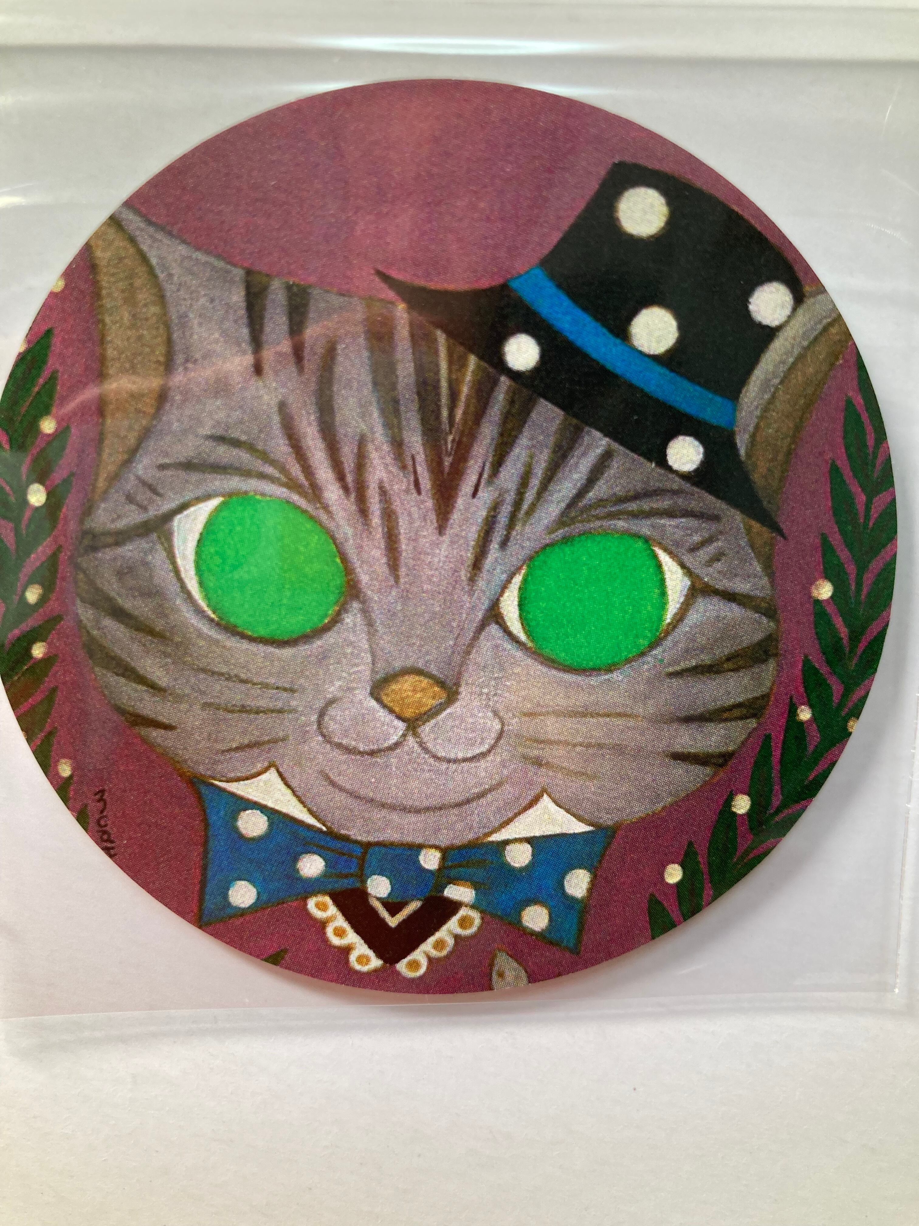 シックなドット柄のハットと蝶ネクタイを身につけた、おしゃれなキジトラさんのステッカーです。落ち着いたカラーで、大人かわいいアクセントに。サイズは約6×6cm。耐水性ではありません。