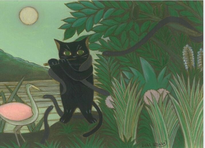 アンリ・ルソー『蛇使いの女』へのオマージュ作品。