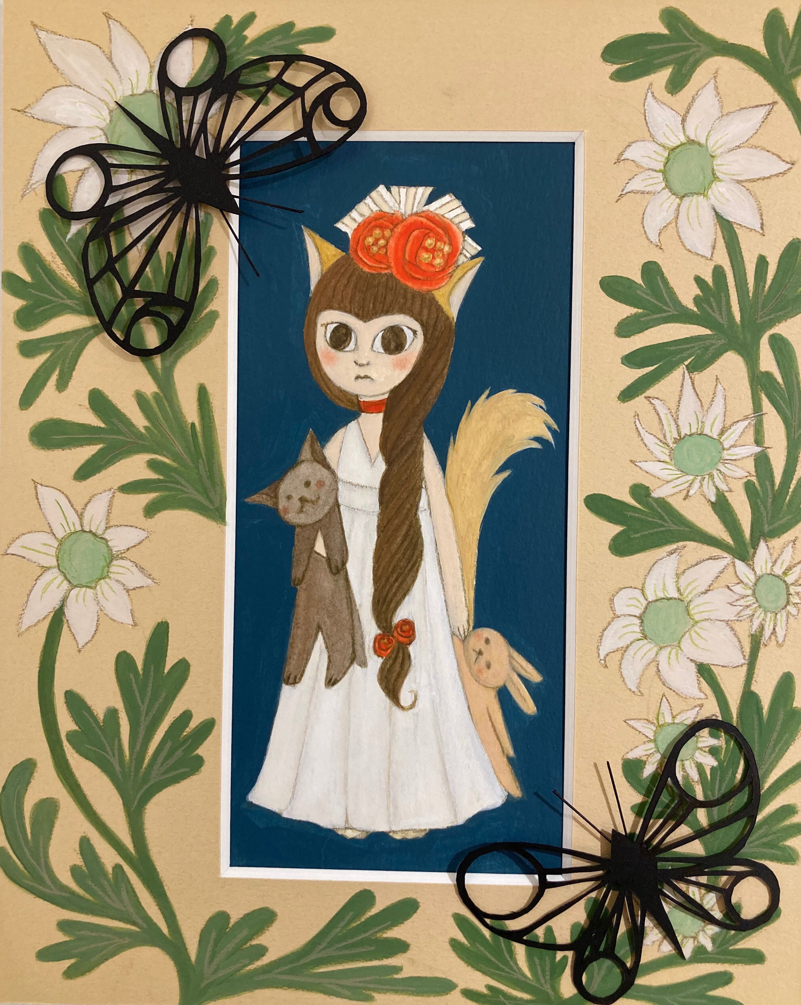 少し拗ねた猫の女の子がお人形さんとおやすみなさい。